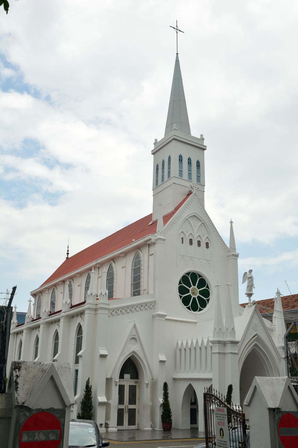 該教堂位于沙面大街與沙面一街交界的東北轉角。由大堂,神父樓、修女樓、圣母山組成,大堂在前,神父樓在后偏東,修女樓在后偏西,圣母山在大堂偏東。現(xiàn)有附屬建筑二幢,一幢為兩層樓房,一幢為平房。教堂基本保存完好。立面主要門窗的山尖和塔樓四角的小尖塔,八角形攢尖頂上復雜的采光窗和棱垛,還有下連續(xù)的小尖拱和由上向下授粉的扶壁柱。反映出天主教堂神秘而向往“天國”的特征。